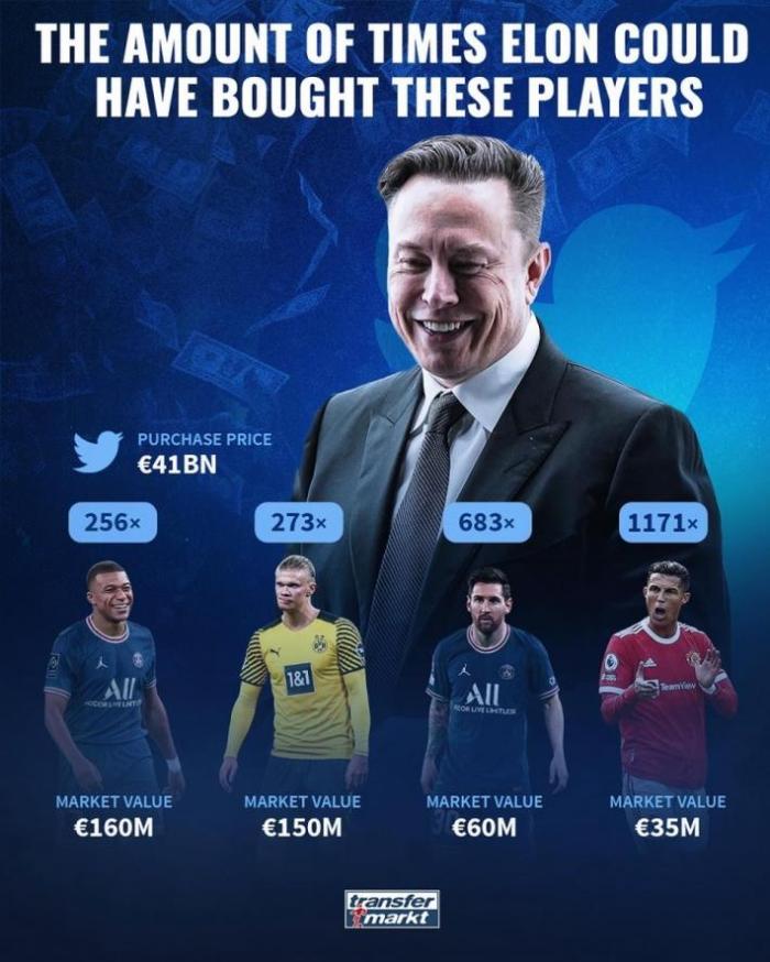 JRS直播网04月29日讯美国科技富豪马斯克最近斥资410亿欧元收购推特,德国转会市场今日再次调侃,称410亿欧元可以买256次姆巴佩,买273次哈兰德。