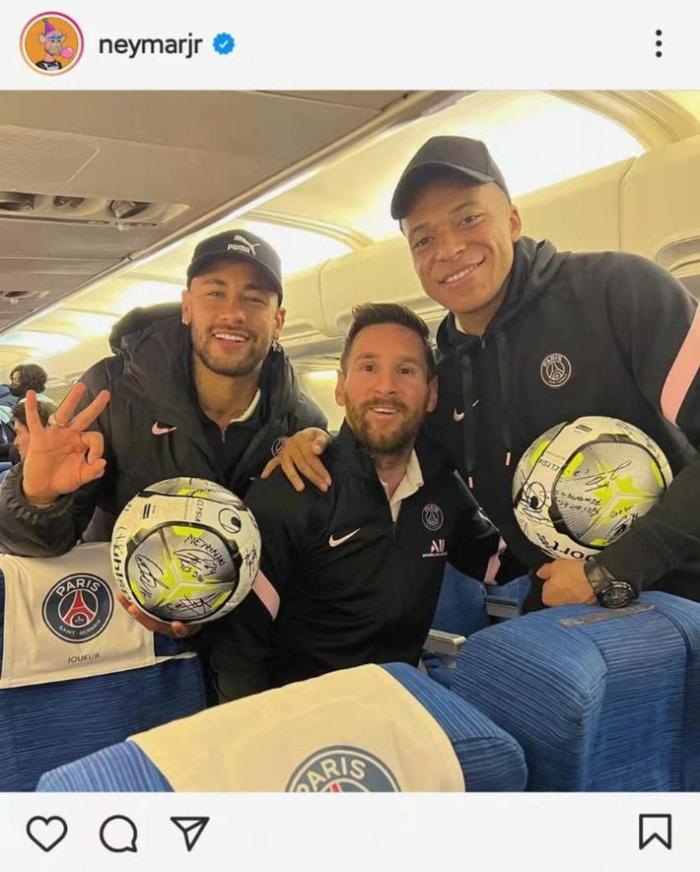 赛后,内马尔更新了自己与梅西、姆巴佩的合影,并配文道:“三进球+三助攻+三进球”。