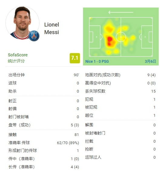 JRS直播网讯3月6日讯 消息,在巴黎爆冷不敌尼斯的比赛中,梅西交出了0射门0进球0助攻和0过人的数据。