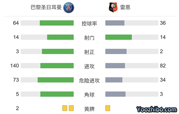 全场比赛结束,巴黎圣日耳曼主场1-0战胜雷恩。