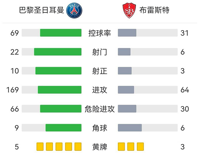 下半场伤停补时3分钟,第90+1分钟,巴黎圣日耳曼这边用米楚特换下维拉蒂,布雷斯特是用巴吉换下费夫尔。全场比赛结束,最终巴黎圣日耳曼2-0击败布雷斯特,继续领跑积分榜。