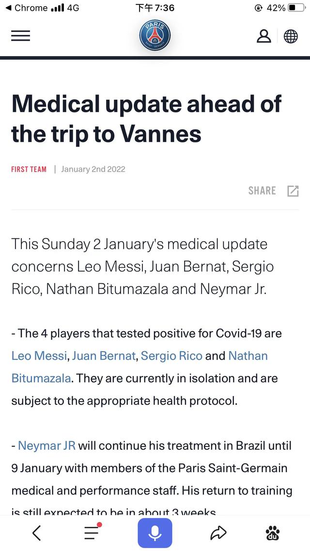 四位感染新冠病毒的巴黎圣日耳曼球员分别是梅西,贝尔纳特,里科,比图马扎拉。他们将进行自我隔离,并积极恢复治疗。
