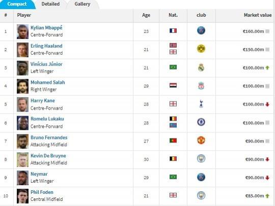 JRS直播网12月31日讯 德国转会市场日前更新了世界足坛球员身价排行,姆巴佩和哈兰德排名前二,维尼修斯、萨拉赫、凯恩和卢卡库并列第三。