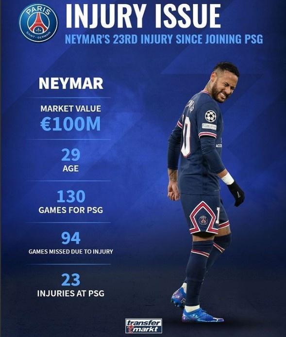 德转统计表明,自从加盟巴黎之后,内马尔已经23次受伤,并因此缺席了94场比赛,只出场130次。