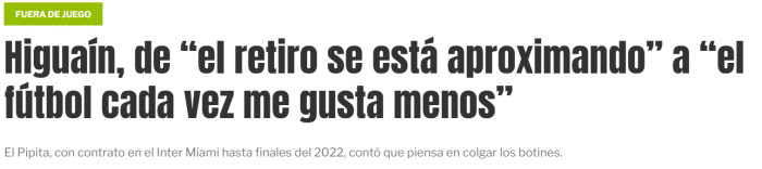 伊瓜因说:“退役的日子已经越来越近,我心里已有其他打算。我会履行和迈阿密国际的合同,这份合同到2022年12月到期。”