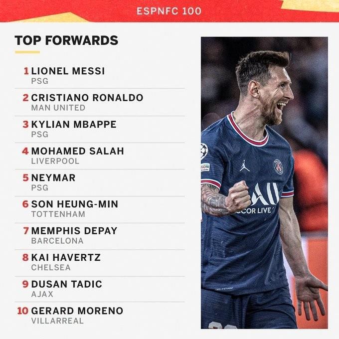 JRS直播网讯 ESPN评选了2021年年度十大攻击手,梅西、C罗和姆巴佩包揽前三。