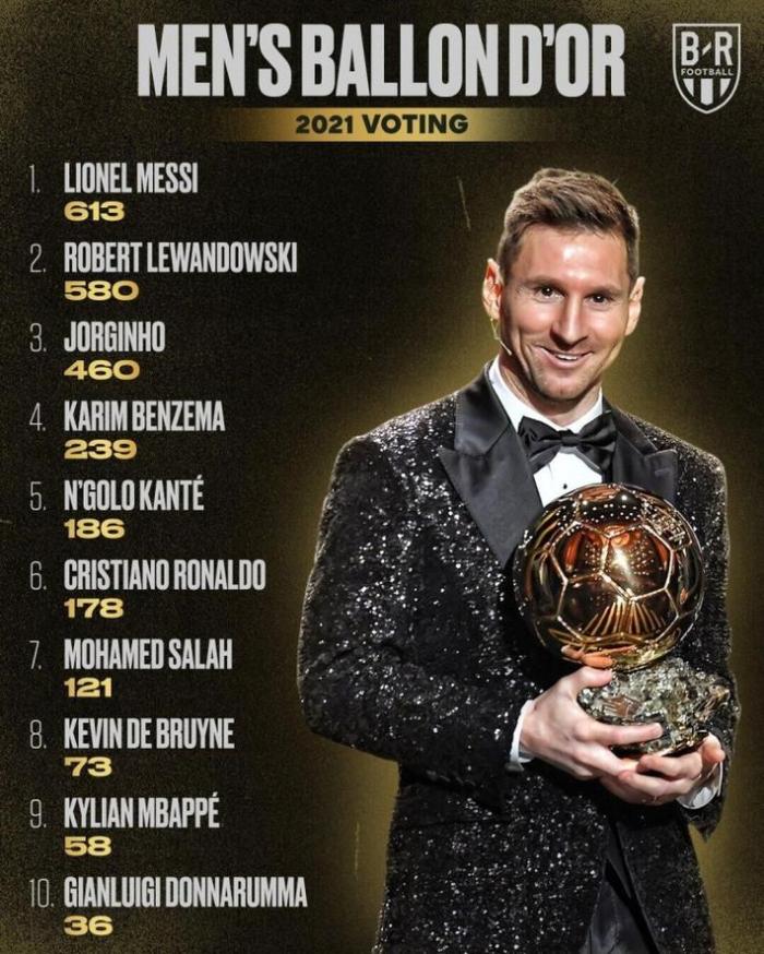 JRS直播网讯 ,金球奖颁奖典礼落下帷幕,梅西以613分夺得个人生涯第7座金球奖,以下为30名候选人获得的票数。