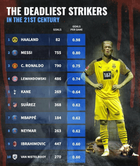 JRS直播网11月01日讯 进球,永远都是足球的主题,那么在本世纪,在足坛谁是进球效率最高的球员呢?近日,德国权威媒体《转会市场网》就盘点了本世纪以来,足坛球星场均进球效率的榜单,其中令人感到意外的是,梅西仅排名第二,而C罗也只排名第三,而排名第一的是哈兰德,他的效率远超梅西和C罗,不知道这个结果是否让您感到意外呢?话不多说,一起看榜单。