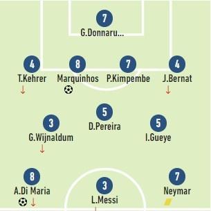 唐纳鲁马(7分),蒂洛-科雷尔(4分),马基尼奥斯(8分),金彭贝(7分),贝尔纳特(4分),达尼洛-佩雷拉(5分),维纳尔杜姆(3分),盖耶(5分),迪马利亚(8分),梅西(3分),内马尔(7分)