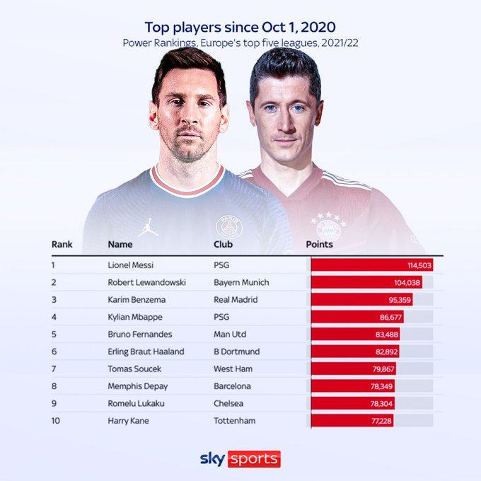 天空体育评价了去年10月1日以来五大联赛球员的表现,梅西以114503分居首,莱万以104038分排在次席,本泽马以95359分排在第三位。英超排名最高的是布鲁诺-费尔南德斯。
