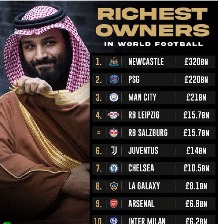 如图,纽卡的新老板总资产有3200亿英镑,他们是足坛最有钱的俱乐部。而此前的第一,巴黎幕后老板卡塔尔财团的资产只有2100亿英镑,比纽卡新老板少了1100亿英镑。而第三的是曼城的老板曼苏尔,他的资产达到了210亿英镑,不到纽卡新老板的10分之一。不得不说,纽卡的新老板真的有钱,纽卡崛起也是时间的问题了。就是不知道需要几年。