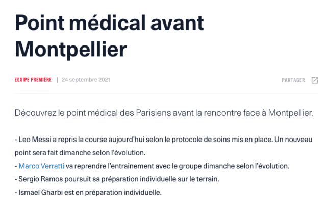 除了梅西之外,大巴黎还公布了另外两位核心维拉蒂和拉莫斯的最新情况。维拉蒂根据伤势恢复进展,周日加入小组训练。而拉莫斯则继续进行个人训练,前皇马队长有望在10月3日,法甲第9轮大巴黎与雷恩的比赛中出场。