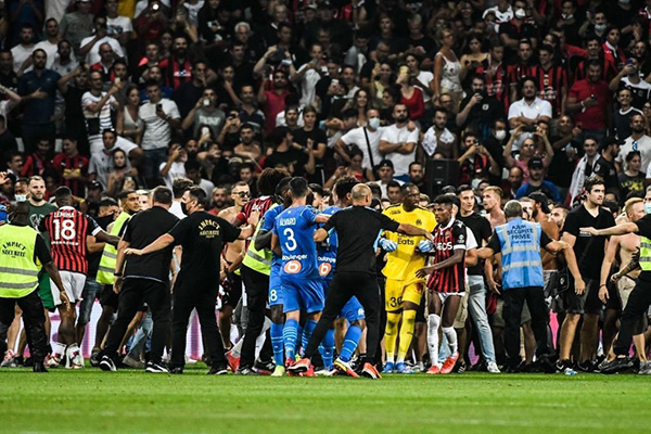 在尼斯主场对马赛的比赛第75分钟,尼斯球迷朝场内投掷杂物,一个瓶子砸中了马赛球员帕耶,帕耶随后捡起瓶子丢回看台。而数十名尼斯极端球迷们冲破球场安保的阻拦,冲进球场和马赛球员发生了冲突,这次骚乱导致比赛无法继续进行,当时的比分是尼斯1-0领先马赛。