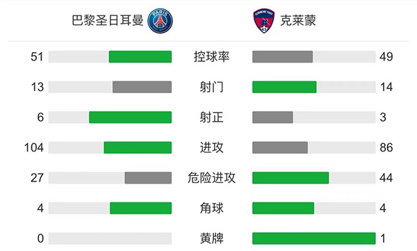 全场比赛结束,巴黎圣日耳曼4-0克莱蒙。