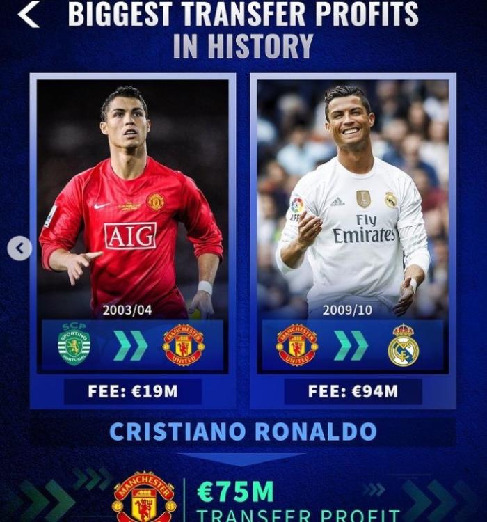 第七的是桑乔,17年的时候,多特花费了780万欧元从曼城带来了桑乔,而今年夏天,桑乔以8500万欧元的价格转会曼联,多特因此赚取了7720万欧元的转会费。而第八的则是C罗,03年夏天,曼联花费了1900万欧元从葡萄牙体育签下了C罗,而09年夏天,C罗以9400万欧元的价格加盟皇马,曼联因此获利高达7500万欧元。