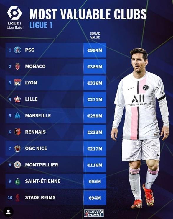 JRS直播网讯 今日,《转会市场》统计了法甲俱乐部身价榜,巴黎以9.94亿独自领跑,高于二到四名的总身价之和。