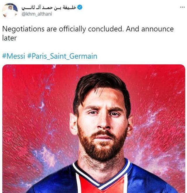 JRS直播网讯 据卡塔尔王室成员Khalifa Bin Hamad Al-Thani在个人社交媒体透露,梅西与巴黎的谈判已经完成。