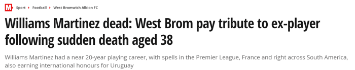 JRS直播网讯 据《镜报》报道,前西布朗球星、前乌拉圭国脚威廉姆斯-马丁内斯上周末自杀身亡,年仅38岁。