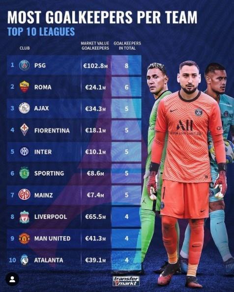JRS直播网讯 德国转会市场对单支球队阵中的门将数量进行了统计,其中大巴黎以8位门将排名首位。