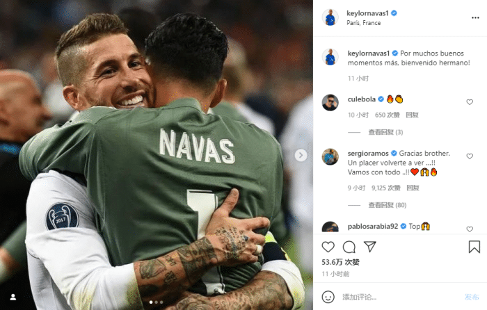 JRS直播网讯 今天,巴黎门将纳瓦斯在Instagram上发文欢迎拉莫斯加盟,他表示很期待与这位前队友再次合作。