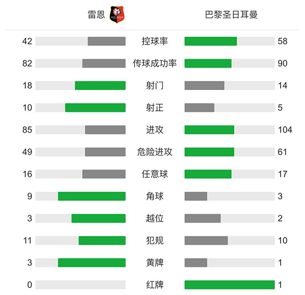 巴黎1-1雷恩 内马尔点射金彭贝染红