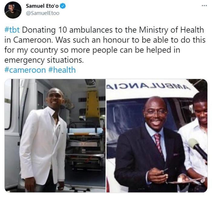 埃托奥一直热衷于慈善事业,此次捐赠的10辆救护车总价值约53万英镑,此前他也曾帮助家乡建立儿童医院。