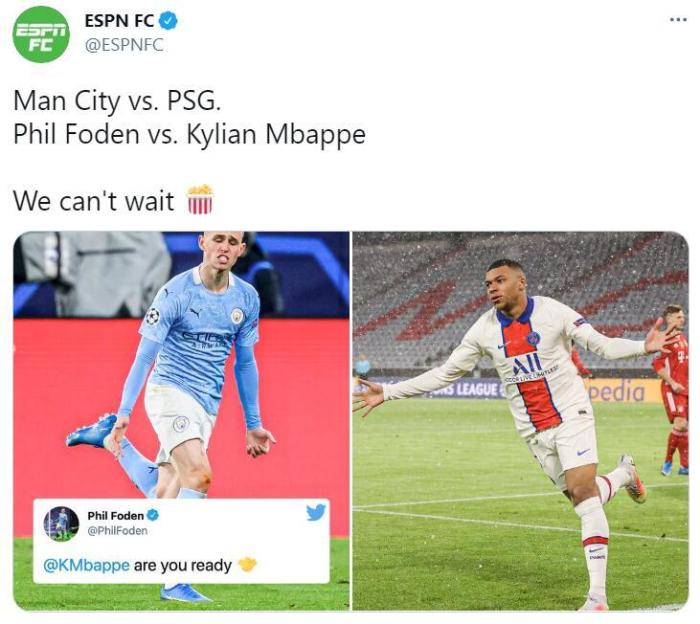 ESPN也表示,曼城vs巴黎,福登vs姆巴佩,我们等不及了。