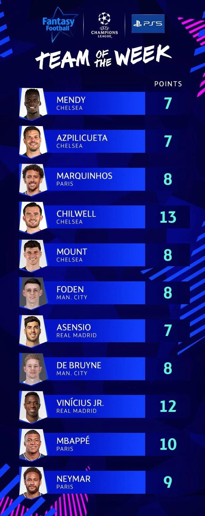 中场:芒特(切尔西),菲尔-福登(曼城),阿森西奥(皇马),德布劳内(曼城)