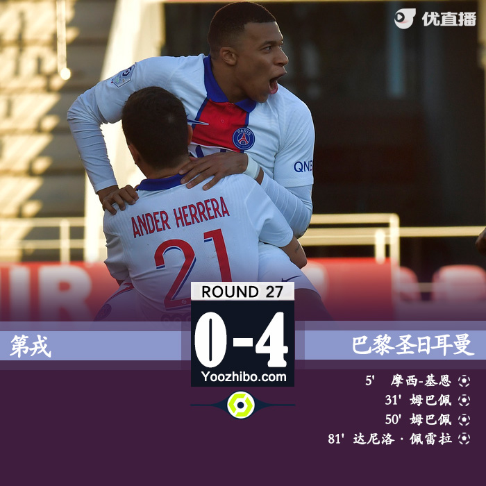 巴黎4-0第戎 小基恩破门姆巴佩梅开二度