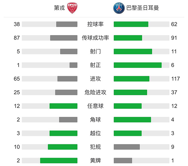 全场比赛结束,巴黎圣日耳曼4-0第戎。