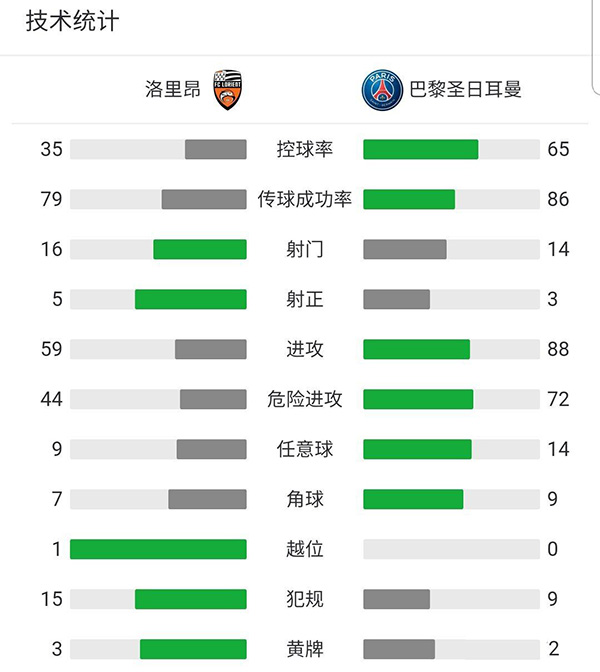 查看:洛里昂vs巴黎圣日耳曼 全场录像技术统计: