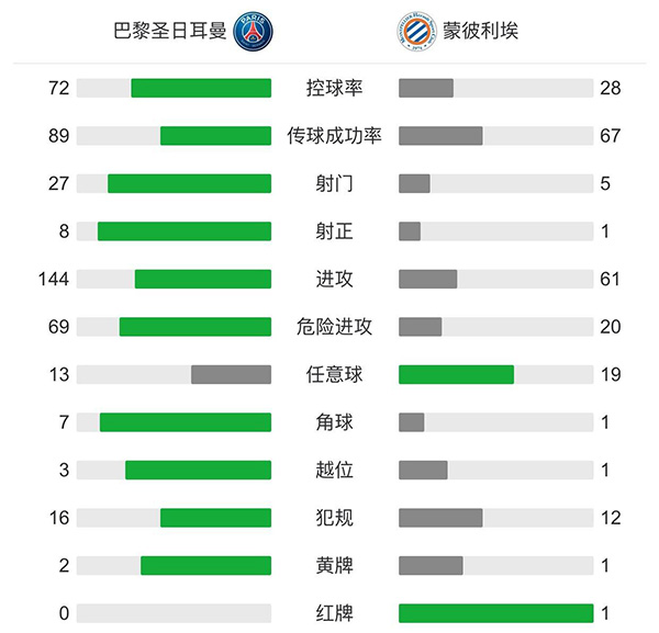 查看:巴黎圣日耳曼vs蒙彼利埃 全场录像技术统计: