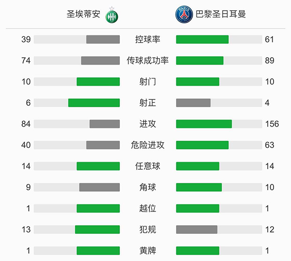 查看:圣埃蒂安vs巴黎圣日耳曼 全场录像技术统计: