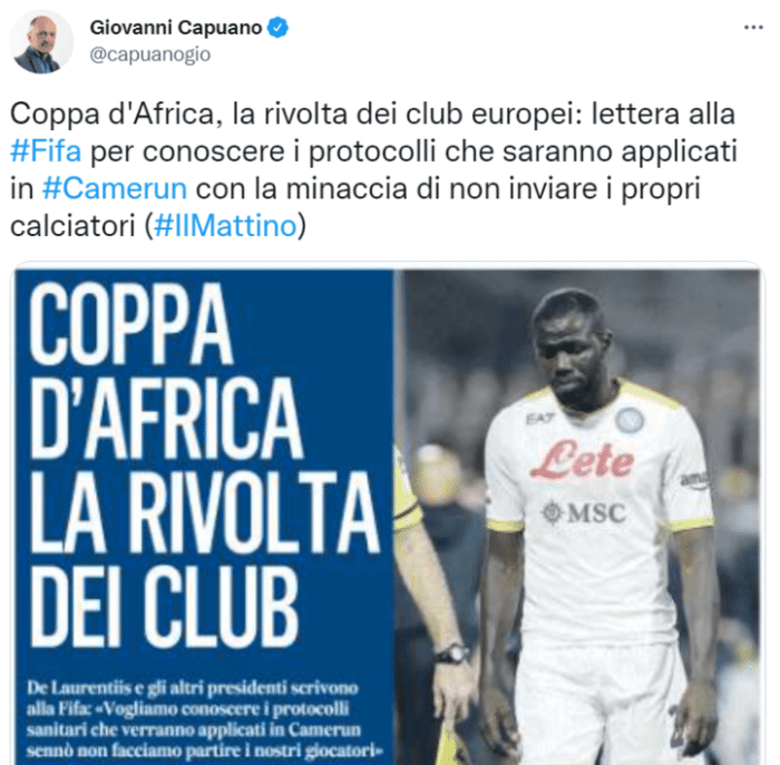 JRS直播网12月17日讯 据记者GiovanniCapuano报道,有一些欧洲俱乐部致信国际足联,威胁不放球员参加非洲杯。