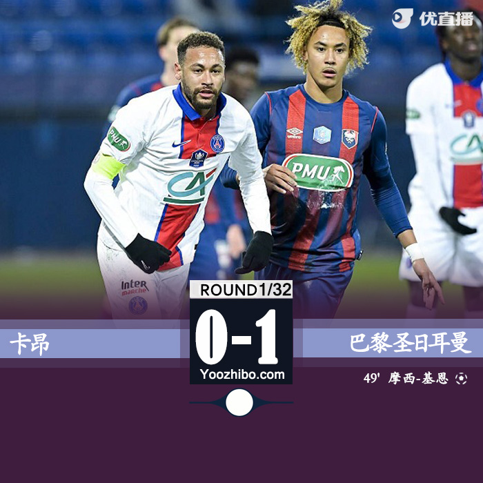 JRS直播网2月11日讯 北京时间2月11日,04:00法国杯1/32决赛,卡昂主场迎战巴黎圣日耳曼。上半场,双方都无明显破门良机,巴黎半场0-0卡昂。下半场,内马尔助攻,小基恩破门,随后内马尔因伤被姆巴佩换下。最终,巴黎客场1-0小胜卡昂。