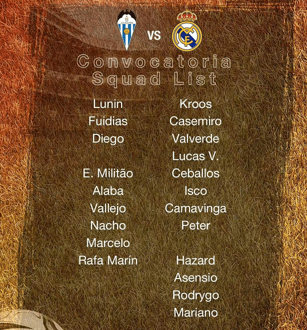 已官宣确认的21人大名单详细人选为:卢宁、富伊迪亚斯、迭戈、阿拉巴、米利唐、纳乔、巴列霍、马塞洛、拉法-马林、克罗斯、卡塞米罗、巴尔韦德、巴斯克斯、塞瓦略斯、伊斯科、卡马文加、彼得、阿扎尔、阿森西奥、罗德里戈、马里亚诺。其中卡马文加、阿扎尔、巴尔韦德、马塞洛、纳乔等上一轮西甲没有首发的球员大概率进入首发阵容,将成为皇马的胜负手。