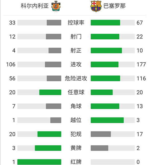 查看:科内利亚vs巴塞罗那 全场录像技术统计: