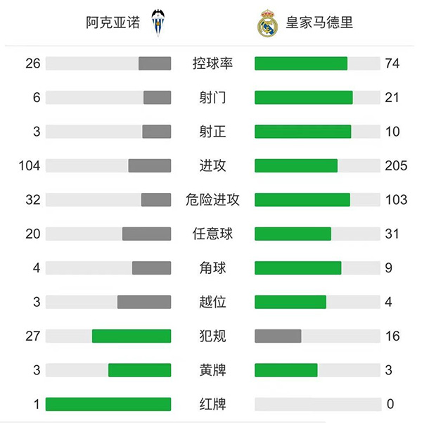 查看:阿尔科亚诺vs皇家马德里 全场录像技术统计: