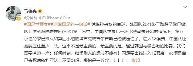 JRS直播网讯 《体坛周报》记者马德兴表示:“凭借孙兴慜的点球,韩国队2比1终于取胜了黎巴嫩队!这就意味着在8个小组第二名中,中国队在最后一场比赛尚未开始的情况下,第八小组的黎巴嫩队和第四小组的塔吉克或吉尔吉斯已经被压住了。进入12强赛,中国队还需要压住至少一队。这个不是最主要的,最主要的是,通过韩国与黎巴嫩的比赛,我们需要清楚一点:任何时刻,指望别人的想法不能有!国足要出线进入12强赛,必须是自己去死磕叙利亚队!不要幻想,哪怕是一丝丝!!!!!”