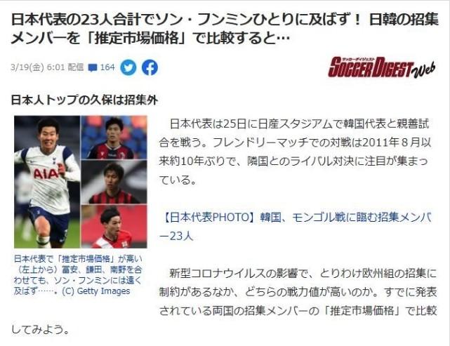 尽管无法为韩国男足登场出战宿敌日本队,但孙兴慜却已经成功折服了日本媒体。北京时间3月19日,日本知名媒体Soccer Digest就罕见的盛赞孙兴慜,他们直言孙兴慜就是当之无愧的“亚洲一哥”。这家日媒写道:“孙兴慜一个人的身价就已经超过了本期日本国家队球员身价的总和,不愧是公认的亚洲足球的杰出代表。”