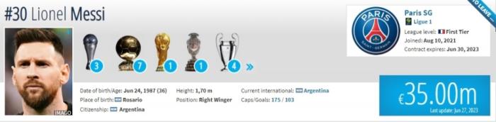 不过尽管36岁的梅西依然保持极高的竞技状态,他在国家队也是当仁不让的核心,但因为年龄等因素影响,梅西身价持续下降。其他几位巴黎球星,姆巴佩的最新身价依旧为1.8亿欧元,内马尔则从7000万欧元降至6000万欧元。
