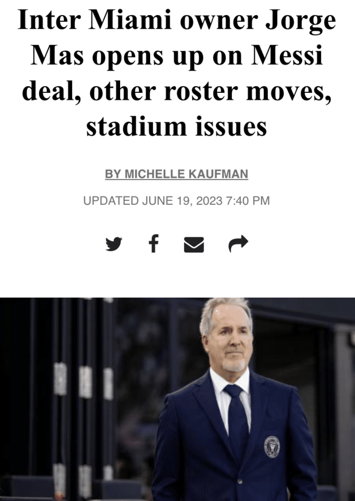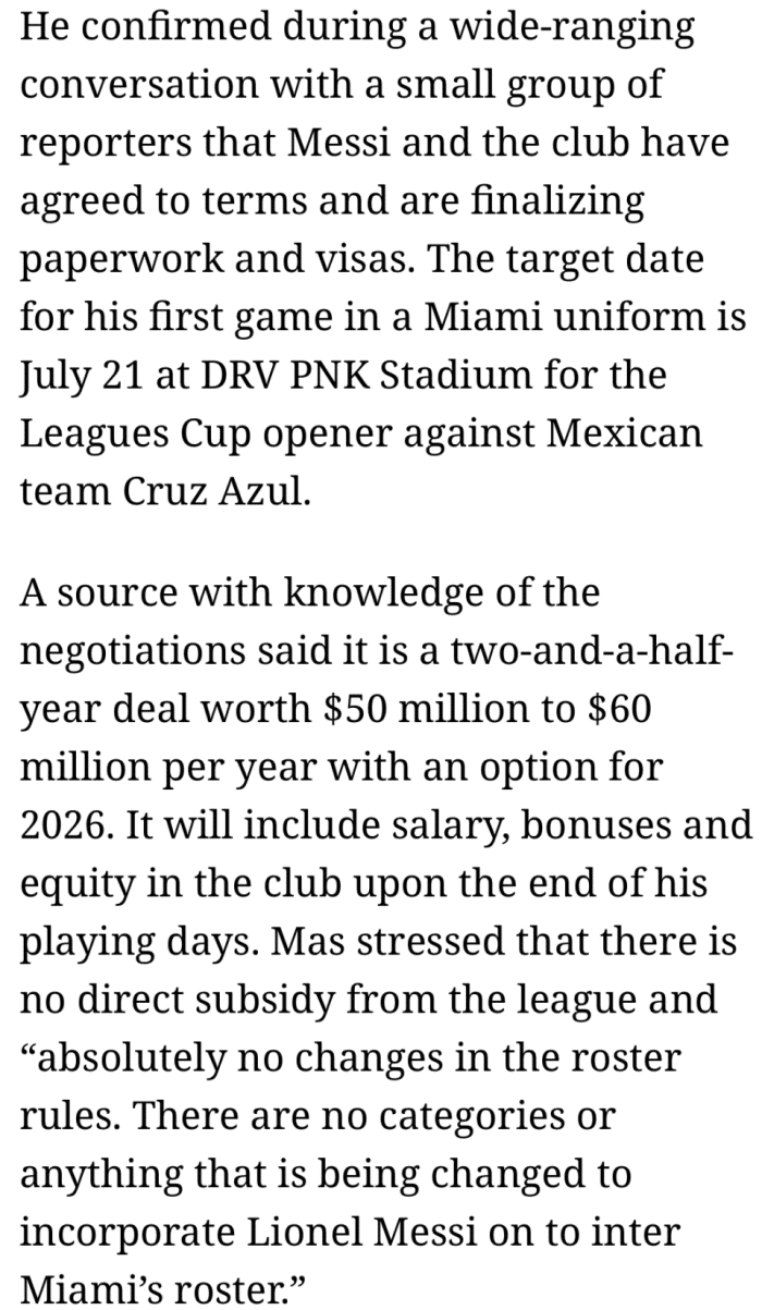 JRS直播网06月20日讯 ,迈阿密先驱报记者Michelle Kaufmann采访了迈阿密国际老板豪尔赫-马斯。而马斯也在采访中证实,梅西已经和俱乐部已经就条款达成一致,正在敲定最后的文书工作和签证。马斯还表示,梅西将会在7月21日迎来迈阿密国际生涯的首秀。他将会在DRV PNK体育场,与墨西哥球队蓝十字的美墨联赛杯揭幕战亮相。