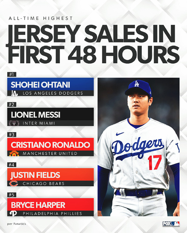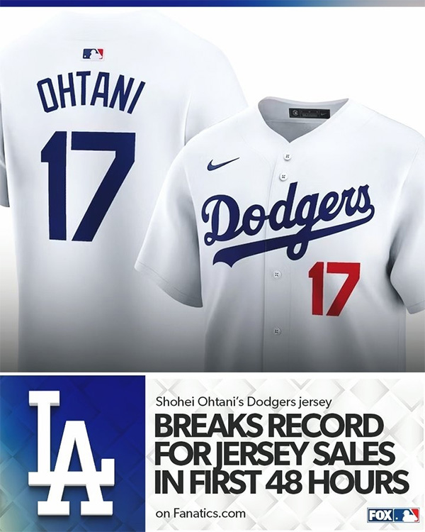 据悉,大谷翔平官宣加盟道奇队后,他的17号球衣,在美国体育用品销售网站Fanatics上销售火爆,创下了48小时内销售纪录,大谷翔平的球衣也成为该网站销量最好的球衣,再次展现了这位日本棒球巨星的超高人气和转会引发的轰动关注度。