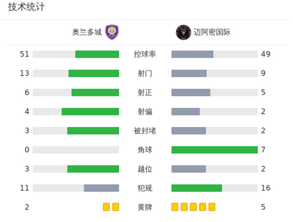全场比赛结束,奥兰多城1-1迈阿密国际。