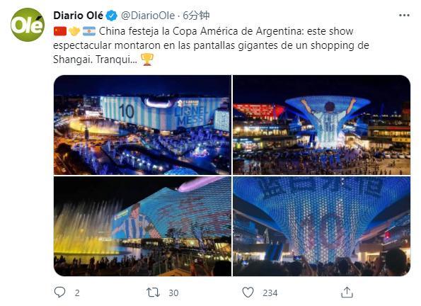 《奥莱报》在官方推特上写道:“中国在庆祝阿根廷获得美洲杯,这场壮观的灯光秀在上海的一家购物中心举行,冷静下来…”