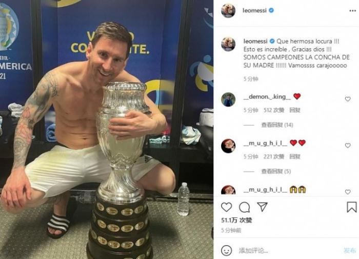 梅西几天前在Instagram上发布的自己与美洲杯奖杯的合影照片,到目前为止,这篇ins已经有超过1941万人次的点赞,这也成为了Instagram历史上最受喜爱的体育类帖子。