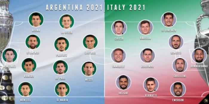 JRS直播网讯 美洲杯和欧洲杯均已落下帷幕,阿根廷和意大利分别夺得冠军,有媒体晒出两队的决赛首发阵容PK,并问:“谁会赢?”
