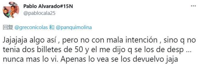 在被问到此事时,阿尔瓦拉多也在社交媒体上回应:“哈哈,确实有这件事,我当时真不是故意的,我手头确实没有50块钱,他答应说让我晚点再给他,可从那之后我再也没见过他了。等我再见到他时,我会还给他。”