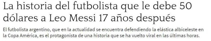 JRS直播网讯 据西班牙媒体《阿斯报》报道,阿根廷报纸《奥莱报》出版的一本名为《梅西,不完整的天才》一书中披露,2004年梅西随阿根廷国青队参加比赛时,曾被队友阿尔瓦拉多领走了50美元的补贴,这笔钱至今没还。