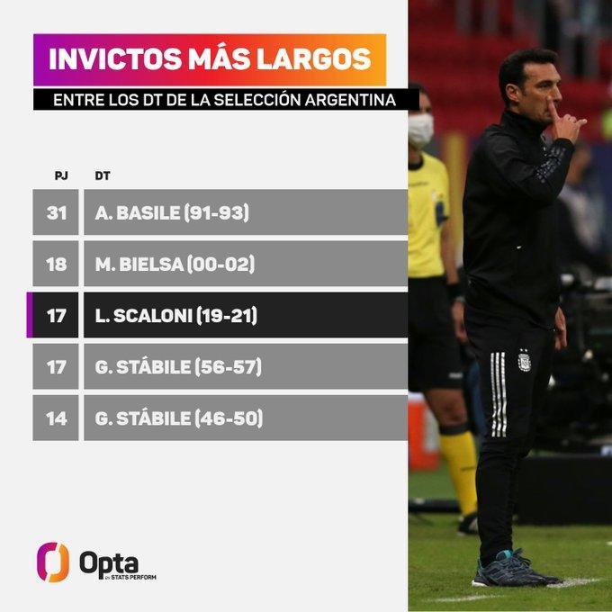 斯卡洛尼也凭借这场胜利追平了斯塔比莱,成为阿根廷队史连续不败场次并列第三长的主教练。